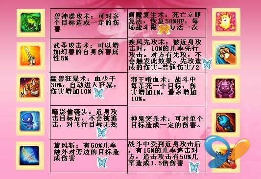 上图对新出的几种技能作了简单的归纳,细心的朋友会发现某些技能里笔者留下了小小的蝴蝶结,这些都是笔者比较推荐学习的技能。首先,标记黄色蝴蝶结的死亡后立即复活的技能(阎魔复生术)适合所有宠物,打上它宠物的生存能力大大提高。其次,标记蓝色蝴蝶结的各种技能适合物理攻击类宠物,提高了物理类宠物的攻击力。然后,来看看其他技能,群攻的技能虽然好看,一回合消耗300MP实在是个大问题,不是拥有最少1500法力的宠物绝对不建议学习。邪王嗜血术其实也是个提高伤害的,但大家都知道开心里不管宠物还是人,死的几率相当小,杀宠加伤害实在不太可取。神鬼突杀术的一定伤害实在不清楚是多少,笔者猜测是一个固定伤害,PK测试区一直没有开放,也不敢给宠物胡乱上书,所以只能等待了。