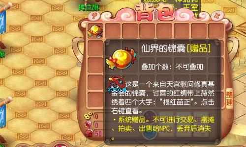 说明:这是一个来自天宫慰问修真基金会的锦囊,讨喜的红绸带上赫然绣着四个大字:“根红苗正”。点击右键查看。 |