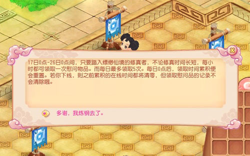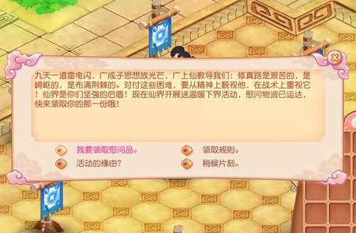 神奇的锦囊先转达了仙家们的问候,言语间真可谓是句句暖热字字温馨,然后得知,在10月17日7点到26日0点间,仙境中的修真者不论修行时间长短,每小时都可领取一次仙界的温暖慰问物品!但考虑到修真兄弟姐妹的阶级队伍太过庞大,每人每日只可领取5次哦。