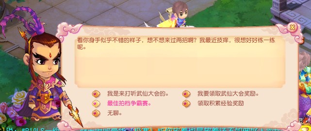 双人PK赛的参加方式很简单。还是武仙大会的那几个NPC,在他们的选项中,多了一个“最佳拍档争霸赛”,每周日的下午3点,双人PK赛准时打响。一切参与模式跟武仙大会几乎一模一样。略有不同的是,考察的NPC,从人变成了动物……最终考核官更是变成了牛魔王……额,也就是阿鲁迪巴!