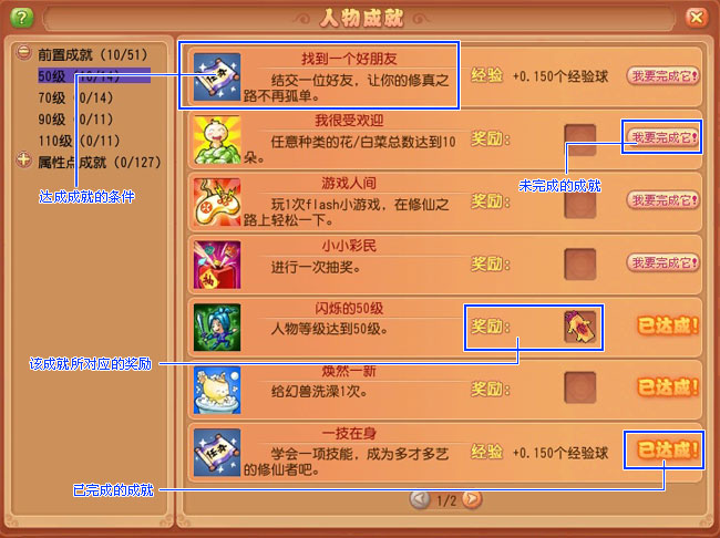 人物的成就系统分为两大类:前置成就和属性点成就。从玩家50级开始就可以完成前置成就了,每20级有不同的成就内容。在完成了所有前置成就后,才可以完成属性点成就。在人物成就的面板内,可以查看完成成就的条件,成就所对应的奖励以及成就的完成情况。在玩家达成了完成成就的条件后,点击“