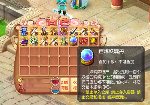 这个百炼妖魂丹,是来自妖魂阵的宝贝,每当你完成大战妖魂阵的任务后,就可以得到蓝魂石或者绿魄石,收集到20个石头就可以换这个宝贝了。