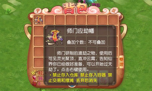 物品说明:师门研制的渡劫之物,使用后可见灵光聚顶,直冲云霄,告知仙界你已经做好准备,可以开始过天劫了。点击右键使用。