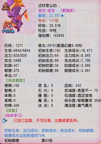 先说夜叉,7个特征分别是加百分之10命中,非生命体,反震20%几率反50% ,鬼附身60星20%几率降防10%3回合,吸食阳气加攻击的,勾魂25%几率 75伤害,附带眩晕3回合,最后一个死亡宣告10几率在3回合后造成目标80%生命伤害。总的来说夜叉攻击附带眩晕,减防,诅咒,反震和最后的死亡宣告,应该说都不错的,负面状态多,不过以他的成长来说来血不是最长,攻击不够,职业不是军队,唔也没官职,可以说被冷落也是正常吧,至少我们区只有一个人养他到了高星的,其他都是养着观赏到40多,话说长得不怎么样的。