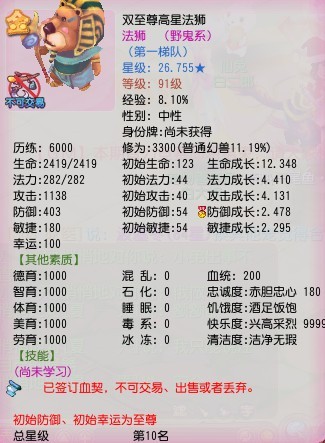 然后是法狮,和埃及的狮身人面像一样的一个宠物,28血,魔族,有着大头增加10百分之MP上限,也有和酋长一样的撕咬特征,还有和和尚一样的20几率抵抗心智状态,唔唯一的特色是有一个单法技能****,消耗法力值给予对方75百分之伤害同时附加百分百的失明伤害,说实话一直没明白失明的宠物会怎么样,失去攻击目标,还是降低命中率,总之比不上眩晕和冰冻这些。