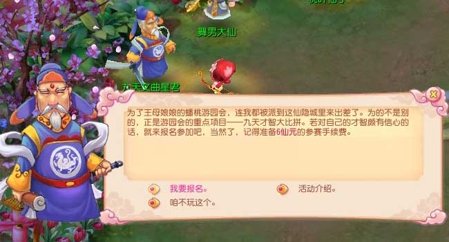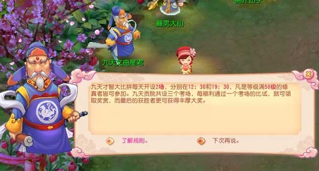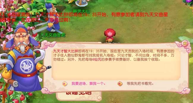 2、等级满50级的才子佳人,在每天的12:30和19:30找到九天文曲星君,缴纳6仙元的参赛手续费后即可进入九天贡院大堂。