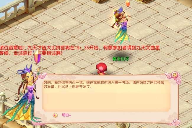 紫玉仙子真是个好说话的仙女,她把九天才智大比拼的详细规则耐心地向你述说了一番,然后就把你送入了第一考场。当然了,她也是很讲原则的,如果你磨磨蹭蹭的耽搁了时间,比试一旦开始,她就不会再送你入场了。