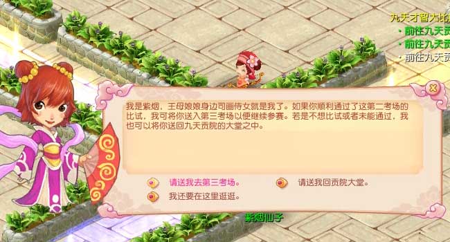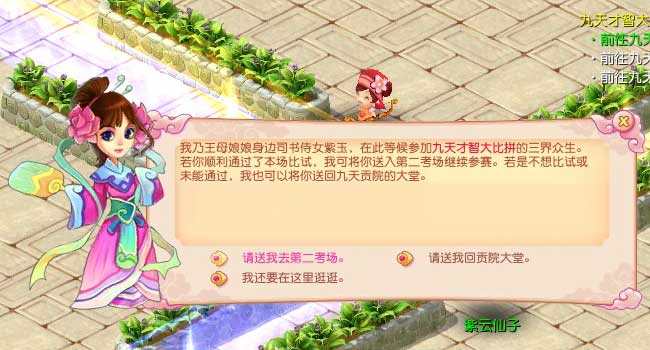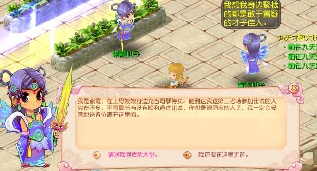 3、在九天贡院大堂找到紫玉仙子(25,30),她负责将参赛者送入第一考场。每个考场会出5道题,答对第一考场的3道题即可由紫云仙子(98,22)送入第二考场,答对第二考场的4道题即可由紫烟仙子(42,64)送入第二考场,在第三考场则需要答对所有的5道题才算通过。