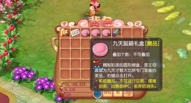 九天聪颖礼盒:精制彩漆的圆形锦盒,是王母娘娘为九天才智大比拼专门准备的奖品,右键点击打开,即有可能获得蛋宠之心、铜钱碎片、幻兽学堂体验券或是好蛋成双器其中之一。
