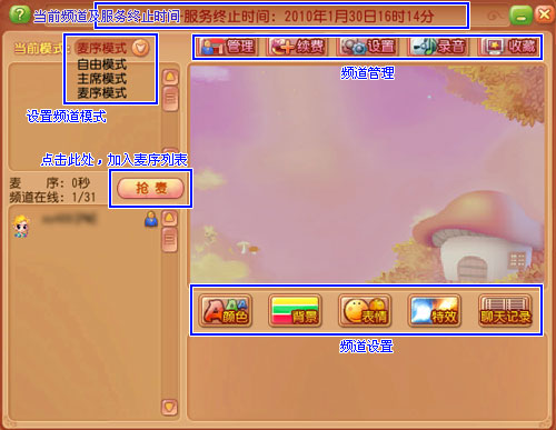 在语音聊天频道中可对频道进行管理、续费、频道设置、录音和收藏。在频道中支持发送声音特效(每个玩家每分钟只能发一次)、播放背景音乐(仅限房主、管理员、麦队首位玩家)、录音等功能。