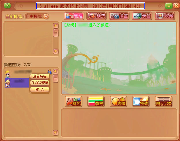 在频道界面的顶部,可查看当前频道名称和服务终止时间,频道中成员在任意时候均可使用灵石进行频道续费,延长频道的服务时间(27点灵石/2小时)。续费可以得到水晶儿蛋宠礼包。付费玩家退出频道后,若距离上次续费时间少于2小时,则保留身份15分钟。