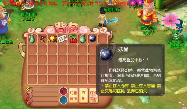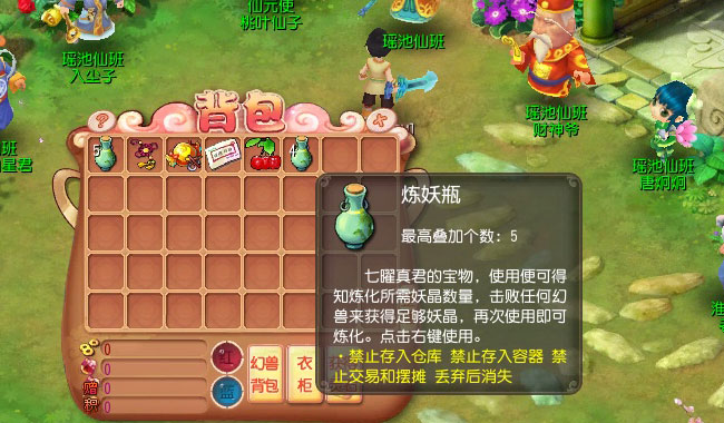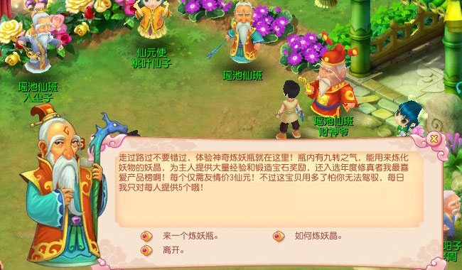 想到这老人家必定不是来贴小广告的站街男,于是上前闲聊一番,想不到真君立刻向你大力推荐他的专利产品——炼妖瓶(真君当年必定也站街过啊……),此宝可炼化妖晶来为主人提供大量经验,并有可能炼化出各种宝石!并且只需友情价3个仙元即可获得!啊?有没有这么好啊!