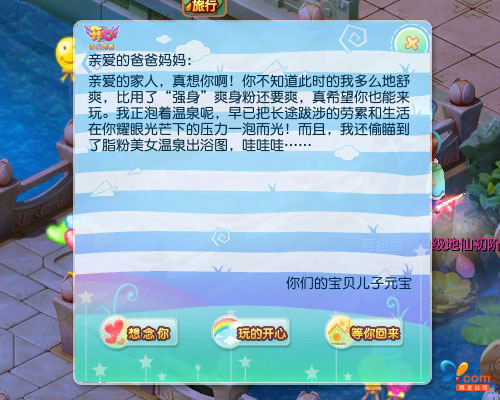 一种育儿之道,岂能满足全方位需要。当你在灶台边、丹炉旁挥洒汗水时,有没有一种能让孩子玩乐学习两不误的方法?《开心》生儿育女再添后天培育玩法,让孩子出门旅游增加历练评分,从而达到星级提升。从现在起,带上你家的宝贝找到“旅行使宝贝贝”,即可让孩子旅行1小时,每次旅行可增加80-120点的历练值,且使用金币支付学费。一但孩子的历练达到上限,最高可有25星的可观提升。