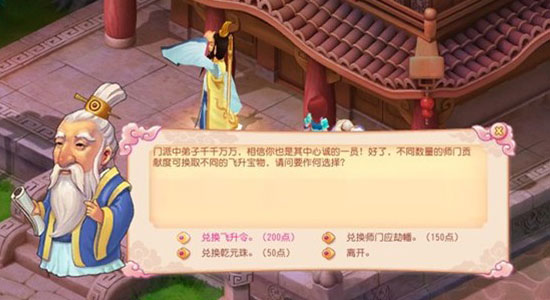 2、获得足够师门贡献度后,即可与飞升使(各门派掌门旁边)换取飞升令(200点师门贡献度)、师门应劫幡(150点师门贡献度)以及兑换乾元珠(50点师门贡献度)。 |