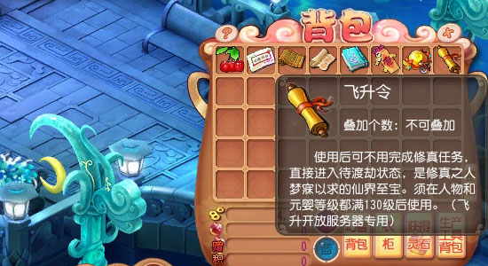 说明:此宝使用后可不用完成修真任务,直接进入待渡劫状态,是修真之人梦寐以求的仙界至宝。需在人物都满130级后使用。