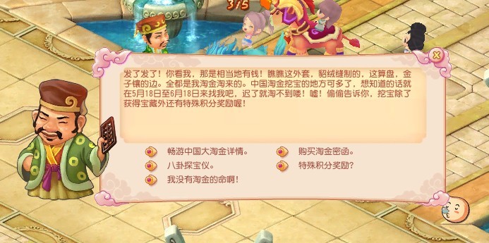 今天更新后,刷新出一个身穿貂皮,手拿算盘,十足的大老板样,他是谁?原来是享誉仙隐城,神龙见首不见尾的第一首富-淘金大王陶大发,想像第一首富一样有钱么,那就按照他的指示开始行动吧。