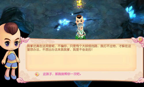终于找到小凡了,幸好还来得及。可是,他倔强的说自己的父亲张书生就在洞里深处,可惜有一个大妖怪挡在前面,如果你不帮他把张书生救出来,他就不走。唉,这孩子怎么这么倔强呢?好吧,救人救到底,都到这里了,多跑一趟也无所谓。