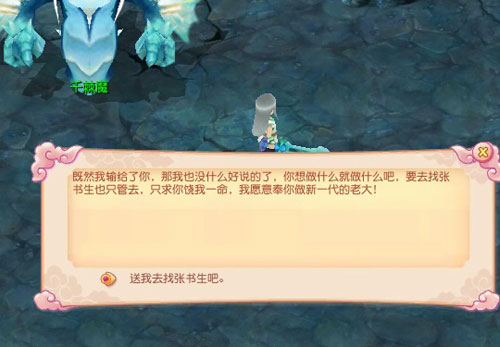 被你打败的这个妖怪名叫千棘魔,曾经是千妖洞的老大,后来此洞被哮天犬霸占,他就成了哮天狗狗的手下,真是可怜的妖怪。虽然和他聊天很有趣,可是你还得继续前进,去救神秘的张书生。