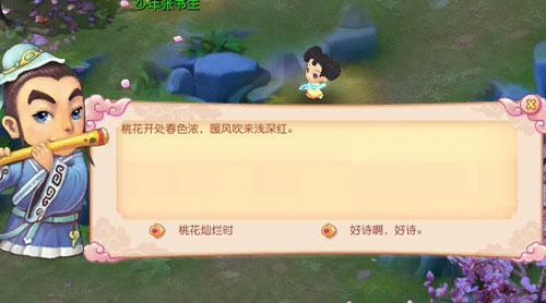 在这片春光明媚的桃花园里,少年张书生正在思慕一位美丽的少女,这似乎也很正常,他请你将自己写的情诗交给那位名叫小樱的姑娘,表达自己的倾慕之情。