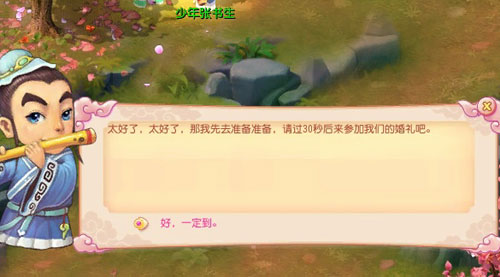 小樱虽然非常害羞,但还是答应了这门亲事,这可是个好消息,你赶紧去恭喜少年张书生。他也非常高兴,并请你作为他们的主婚人,不过他要准备一下,请你等上30秒再去找他。
