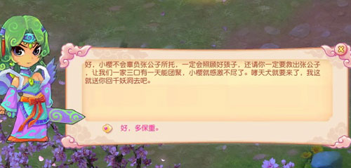 小樱虽然见到玉佩,但说什么也要和张书生在一起,真是有种!不过你在你苦苦劝解下,她终于为了肚子里的骨肉着想,含泪离开,同时她也将你送回千妖洞,搭救苦命的张书生父子。