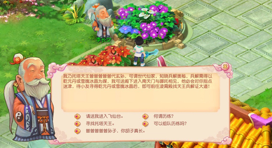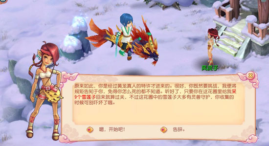 3, 传送至雪山花圃,与风灵子对话,领取收集雪莲子的任务,成功收集九颗雪莲子就算通过试炼。 |