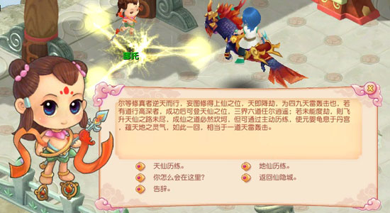 原来这天仙主动历练极为艰难,哪吒说了,需要有坚忍不拔的毅力和强健的肱二头肌方能胜任这项试炼。你若下定决心,他便可将你送往二仙山脚,在山中试炼,成功后便可进入麻姑洞找他师叔黄龙真人求一颗雪魄冰晶,得到此物后再前往凌霄殿找李天王,他便可以此物助你在兵解时护住元神,成功转世顿悟。