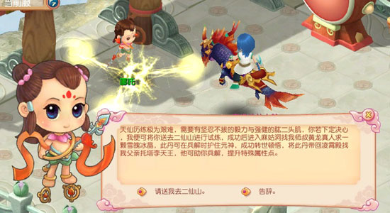 2, 与哪吒(飞仙台20,33)对话,领取主动历练任务,并传送至二仙山脚。