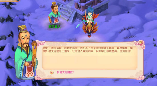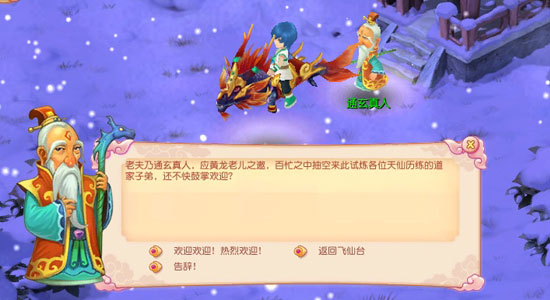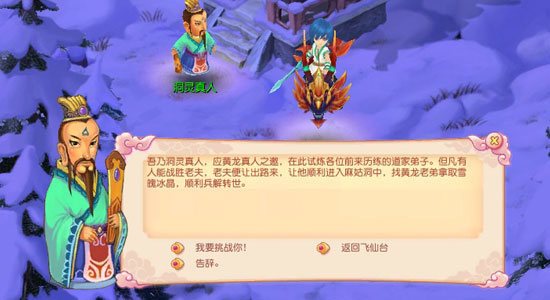 当你风尘仆仆的赶入麻姑洞中,却见黄龙真人手持拂尘,笑眯眯的看着你。他奉天帝之命在自家山中设试炼之所,供像你这些有意进行主动历练的道家弟子一试身手,若有人能闯关成功,就可找他领取雪魄冰晶一颗,大开方便之门。