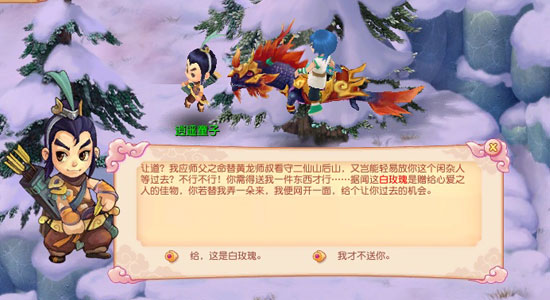 你将一朵白玫瑰给他,他便将你随机传送至二仙山的三处试炼之所,你若通过试炼,他便让出道来,使你继续前行。