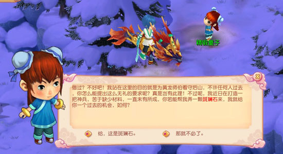 第二位拦路的童子叫精锻童子,此童子长于锻造兵器,近日却因材料缺少而懊恼无比,你若送给他一颗斑斓石,他便将你传送到二仙山的试炼之所,让你参与试炼,若是通过试炼,便许你过路。