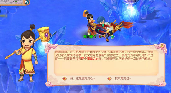 第三位拦路的童子是邀月童子,此童子奉师父之命来替黄龙真人看守二仙山后山,天寒地冻的,又没个小伙伴可以陪伴,正懊恼着呢。你若送给他两个蛋宠之心,或许他会网开一面,随机将你送入二仙山的试炼之所,给你一次过路的机会也说不定哦。