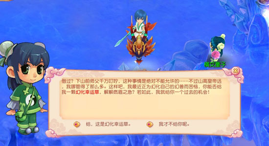 第四位拦路的童子叫横艾童子,他正为幻化自己的幻兽而苦恼,你若能送给他一颗幻化幸运草,解他燃眉之急,他就能将你随机传送到二仙山的试炼之所,给你一次过路的机会。