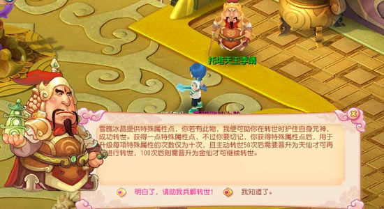 5, 前往凌霄殿,将雪魄冰晶交给托塔李天王,可获得一次兵解的机会,主动历练,转世顿悟,获得特殊属性点。