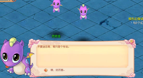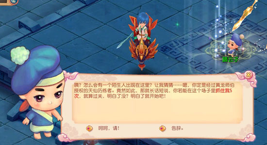 2, 传送至幻兽洞府,与幻飞子对话,获得易容丸,使用易容丸后,你将随机变成幻兽洞府中五只幻兽其中一只的模样,且你只能与模样相同的幻兽对话。当你与五只幻兽全部对话后,就算通过试炼。