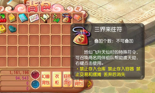 在九次挑战实力的天劫中,担心实力不济怎么办?别烦恼,只要有80点师门贡献度,就可以兑换到三界来往符。它是师门最新研制的渡劫之物,可以召唤2名同伴组队帮你一起应对困难重重的天劫。兄弟齐心,其力断金!