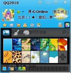 点击QQ上面的小按钮最右边的按钮,点击“+”按钮,选择图片即可让开心的气息满布你的QQ了,如下图: