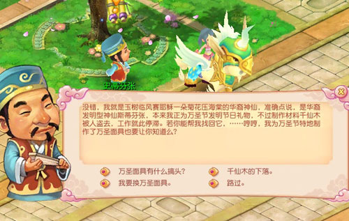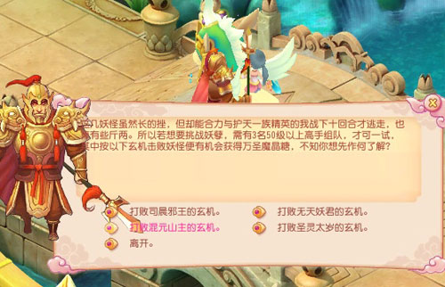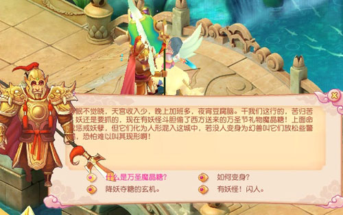 修真者替天行道在所不辞,你当然要主动请缨前去找出妖怪。不过太尉告诉你妖怪颇有些本事,需要有50级以上的3人前往,否则万一有个闪失,他可不会帮你们买保险哦!同时太尉小声透露,如果队伍中有人进行了特殊的变身后,还可以有机会在击败妖怪后得到万圣魔晶糖哦!