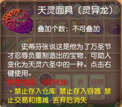 看看背包中的千仙木数量,正好可换取三类面具中的天灵面具,于是挑选了天灵六圣中的灵异龙面具!只听史蒂芬张叽里咕噜念了些听不懂的咒语,一个奇怪的面具和赫然出现在你的背包之中!