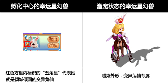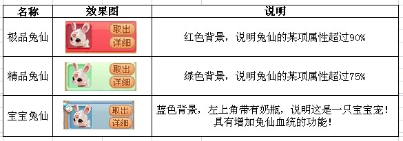 一、幸运星幻兽:超稀有幻兽,又称变异兔仙,它拥有独一无二的炫耀外形! 稀有度:★★★★★ 二、修为兔仙:兔仙在孵化时,有机会孵化出天生带有修为的兔仙,修为在100-200之间!史无前例具有先天优势的兔仙,让您的蛋宠一出生,就高人一等。 稀有度:★★★★★