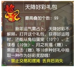 注:若您的背包有一个以上的空位,从孵化器中取出至尊兔仙时,“天降好彩礼包”就会自动发放至背包中。
