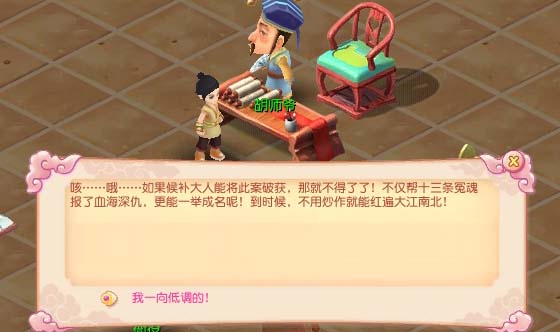 近日烟波镇中发生了一起命案,作为郁郁不得志的、仅是一位候补知县的你来说,如果能查出个真相来,离翻身的时日也不远啦!有空的话就找胡师爷探讨探讨案情吧!