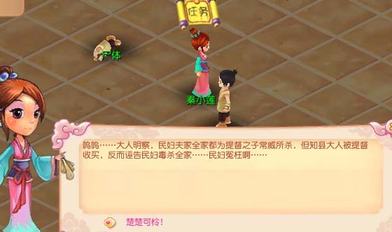 思来想去,你和胡师爷一致认为当事人秦小莲是最为了解案情的人,于是你找秦小莲询问案发详情。秦小莲一副楚楚可怜样,你看了好是心酸。