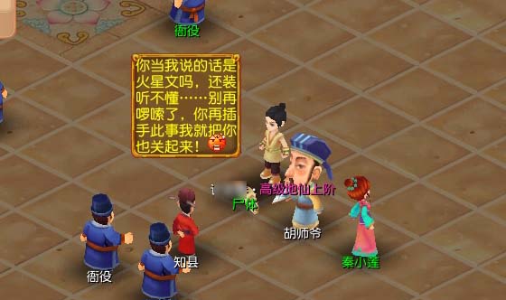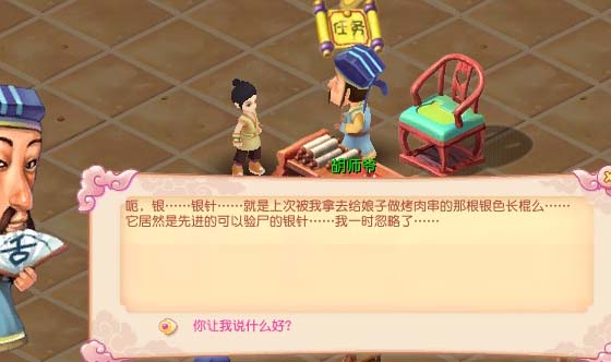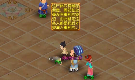 1、进入烟波镇后,不明就里的你找胡师爷(衙门 49,28)问个究竟。