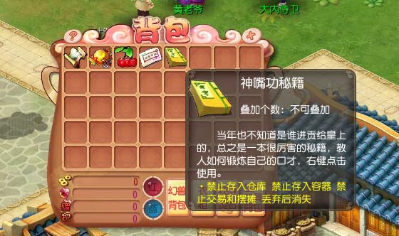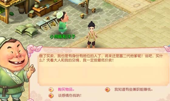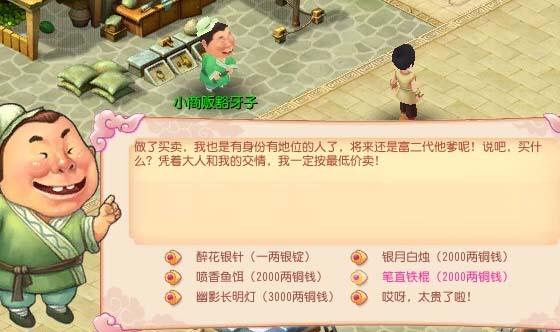 神嘴功秘籍里说到锻炼口才的物品,都可在小商贩豁牙子处买到。什么?银两不够?别急,豁牙子还知道哪里有能赚钱的事儿,你也可以去兼职赚铜币。