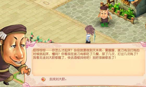 你来到张三身边,他见你才起床,急坏了。快去酒楼找刘大厨吧!别把饭碗都丢了!