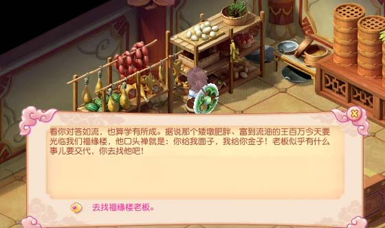富到流油的王百万今天要光临我们福缘楼,他口头禅就是:你给我面子,我给你金子!福缘楼老板似乎有什么事儿要交代,你去找他吧。