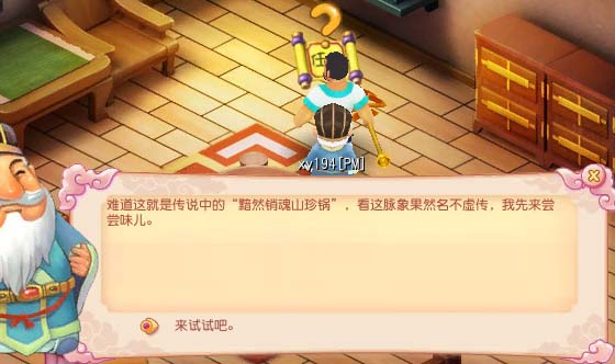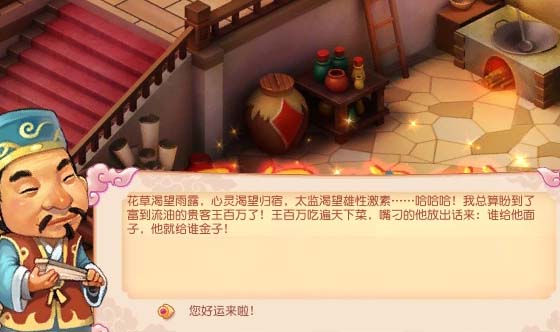 花草渴望雨露,心灵渴望归宿,太监渴望雄性激素……哈哈哈!他总算盼到了富到流油的贵客王百万了!福缘楼准备拿出祖辈流传下来的“黯然销魂山珍锅”来招待他,这有一份采购单和3000铜币,你根据这上面的食材去采购吧。