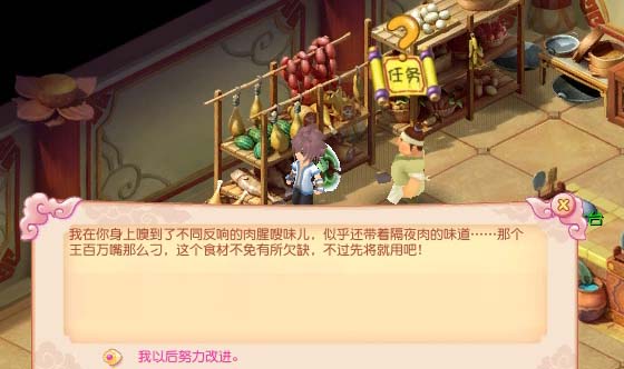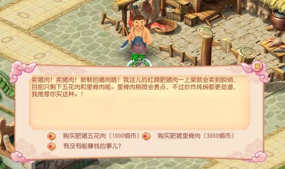 红颜肥猪五花肉只要1000铜币,但味美的红颜肥猪里脊肉要3000铜币,屠夫推荐你买后一种。但是荷包里钱不够怎么办呢?别急,城里有些能赚钱的事儿,你也可以去兼职赚铜币。(注:猪肉的好吃与否影响到最终菜肴的美味度)