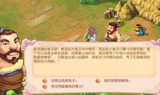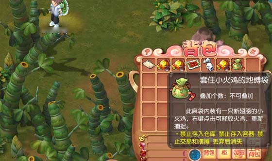 如果要火鸡的话,猎人·袁飞有个引诱火鸡自投罗网的“喷香地缚袋”,它散发出诱人的香味,按成本1000铜币给你,有了它就能很容易捉住火鸡啦,你去南门狩猎吧!假如套住了断翅膀的小火鸡,可以释放它,重新捕捉!只要不辞辛苦,总能捕获味鲜肉嫩的大火鸡。(注:火鸡肉的大小影响到最终菜肴的美味度)